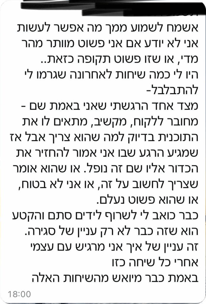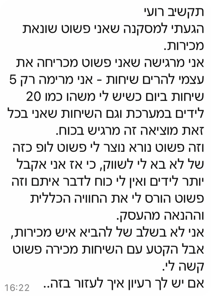 אבל בפועל, כל שיחה גמרה אותה. היא הייתה נכנסת בכל הכוח, מסבירה, עונה, מנסה להבין את הלקוח, וכל פעם יוצאת עם הלשון בחוץ.